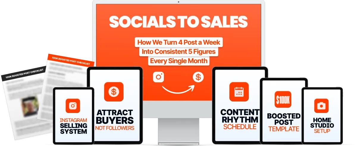 You are getting access to the Socials to Sales course, Instagram selling system, home studio setup, £100k boosted post template, content rhythm schedule and attract buyers, not followers' strategy.